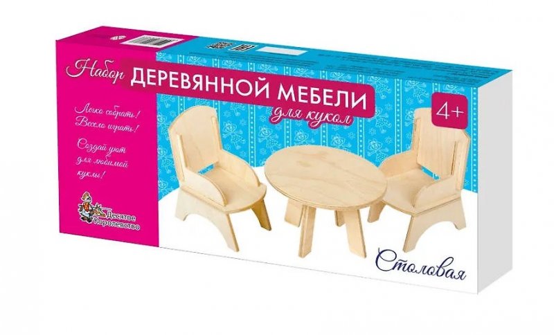 Набор деревянной мебели "Столовая" - стол и два кресла. Простой 3D-конструктор легко собирается состоит из 11 деталей, выполнен из фанеры высшего качества. Деревянная мебель дает большой простор для детской фантазии, предлагает возможность изменения дизайна с применением наклеек, выжигания по дереву, безопасных красителей или их комбинации.