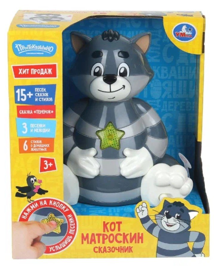 Вашего малыша приведёт в восторг эта игрушка в виде обаятельного кота Матроскина со светящейся кнопочкой в виде звезды. Ребёнок с удовольствием будет нажимать на эту кнопку и слушать весёлые песенки, мелодии, увлекательную сказку и интересные стихи про животных.