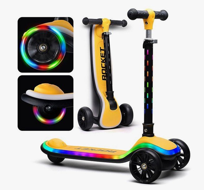 Самокат трёхколёсный ROCKET светящиеся колеса PU, дека, рулевая стойка, цвет жёлто-чёрный R0200