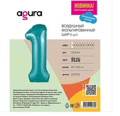 Шар фольгированный "Цифра 1" 40/100см Бирюзовый 1207-5032